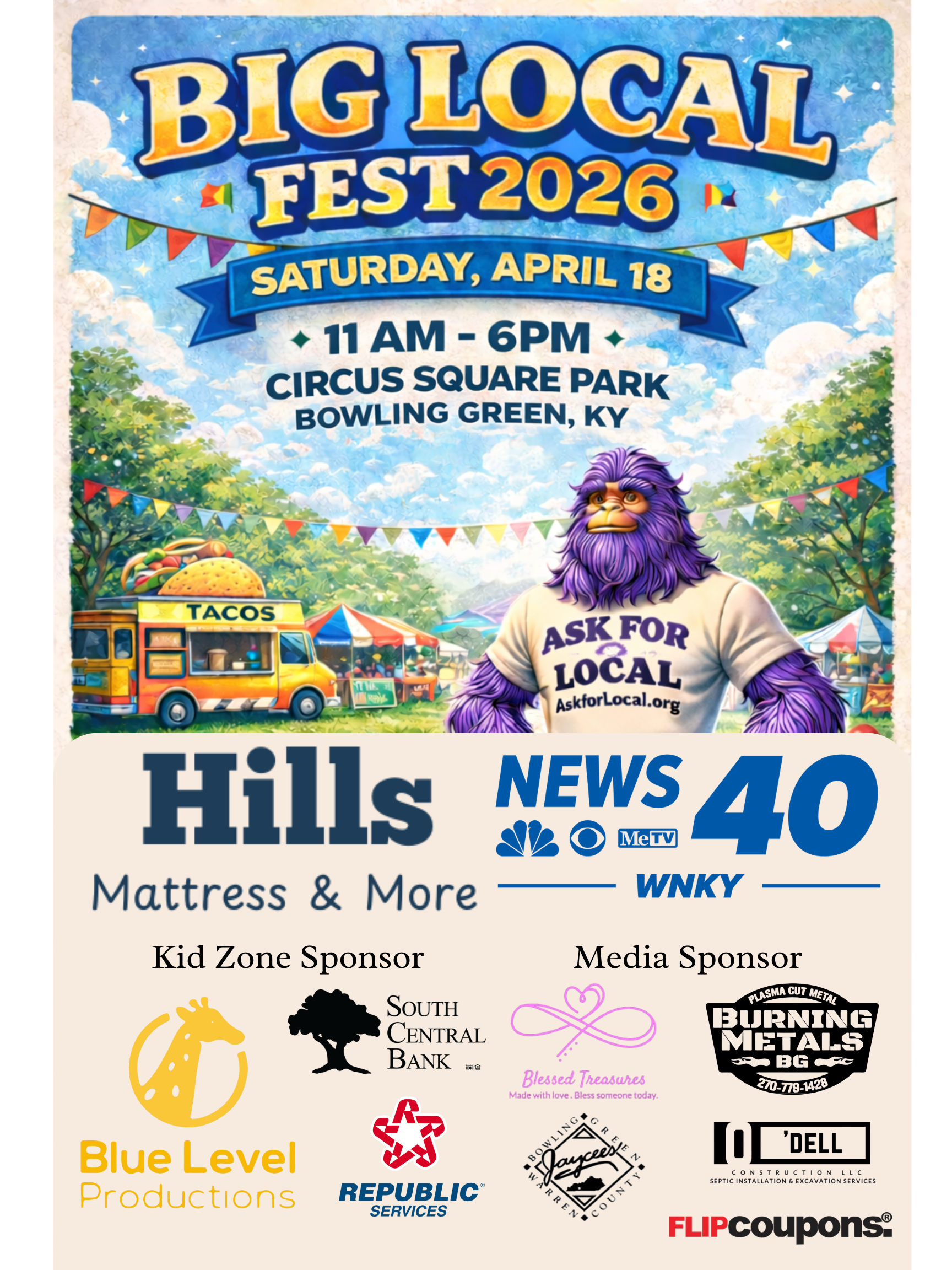 Become a vendor at the 2026 BiG Local Fest. Last year over 3 thousand neighbors attended the fest and we are increasing our out reach this year to bring together even more of the Bowling Green, Kentucky and surrounding area community to support local arts, music , crafts, food trucks, restaurants, bars, breweries, distilleries, self care and so many other local businesses. You do not want to miss this opportunity to be a part of the BiG Local Fest. Booths, vendor spots, and food truck spots are now available. Sign up today to be a vendor!